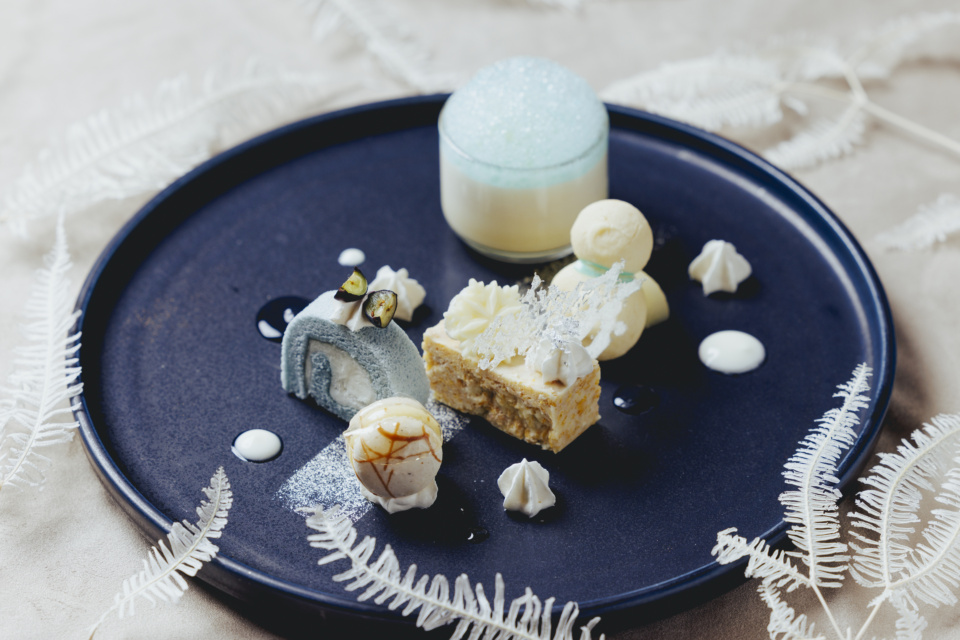 The plate features delights such as a pear and white chocolate mousse cake made with Senshuan’s Yamaoyaji, and a blue yogurt roll cake. Designed in soft white and pale icy blue, it reflects the way freshly fallen snow can appear with a faint blue glow.