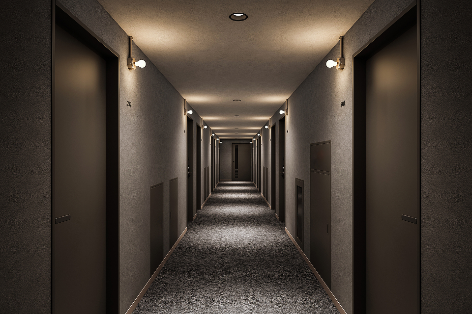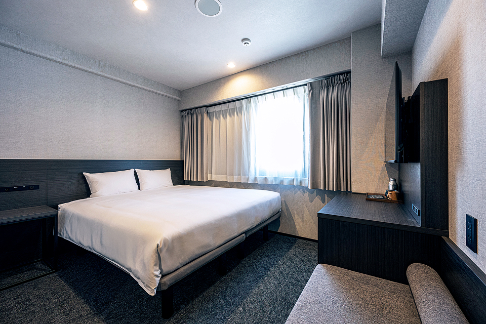 1Fレストランの賑わいとは対照的に、客室階は街中の喧騒を忘れさせる、シックで落ち着いた空間。