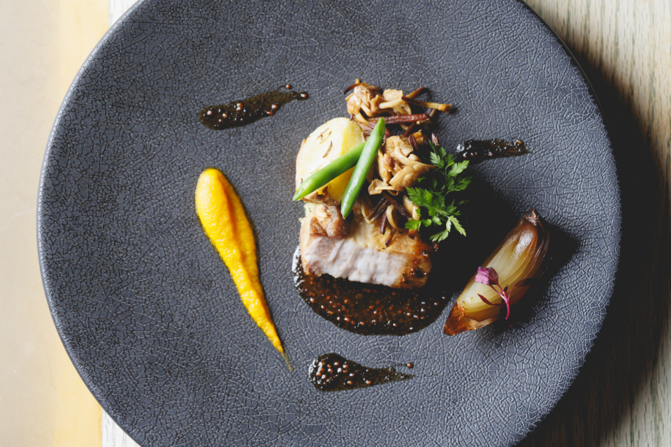 ハーブ豚を柔らかく火入れし、香ばしく焼きあげました。タスマニアマスタードとバルサミコの酸味が調和し、道産野菜とともに味わえる一品です。