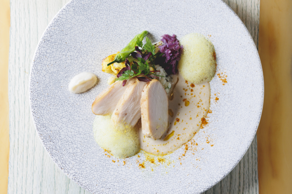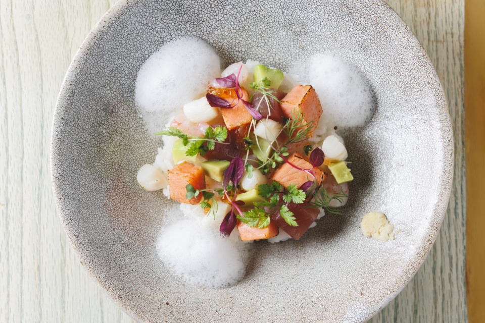 オリーブオイルと塩で魚介の旨味を引き出し、銀鮭と小柱を香ばしく炙りました。すし酢の泡で酢飯のような広がりを添えた、THE KNOTスタイルの海鮮丼です。