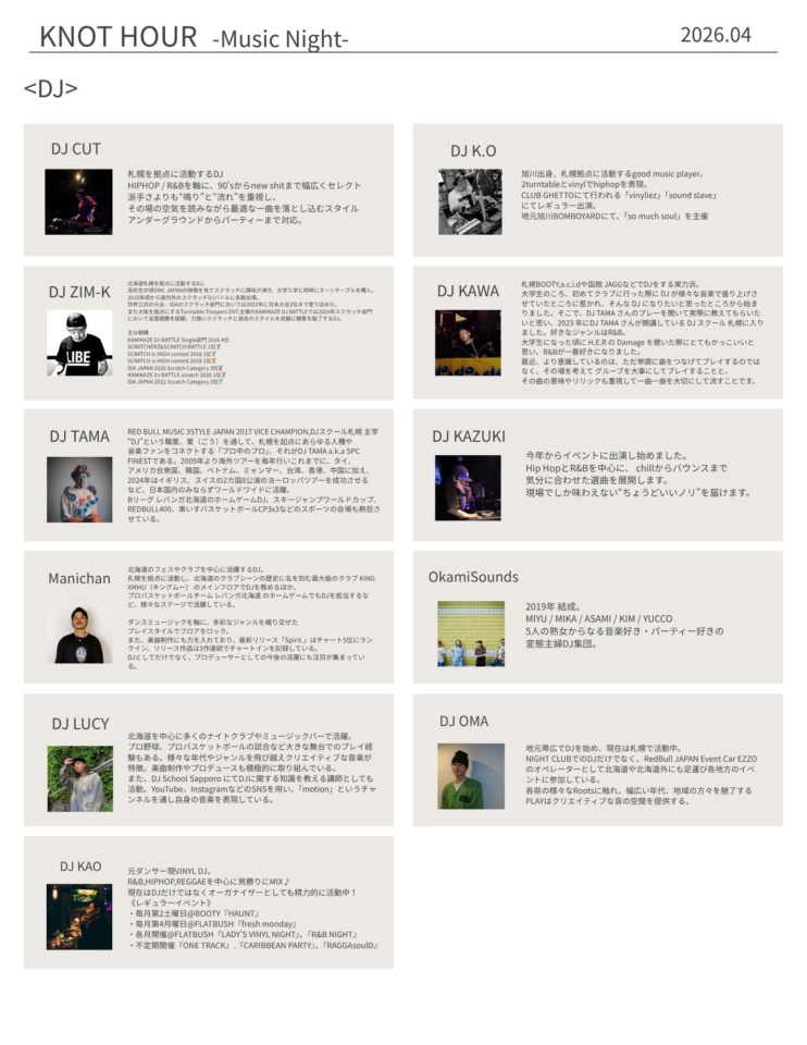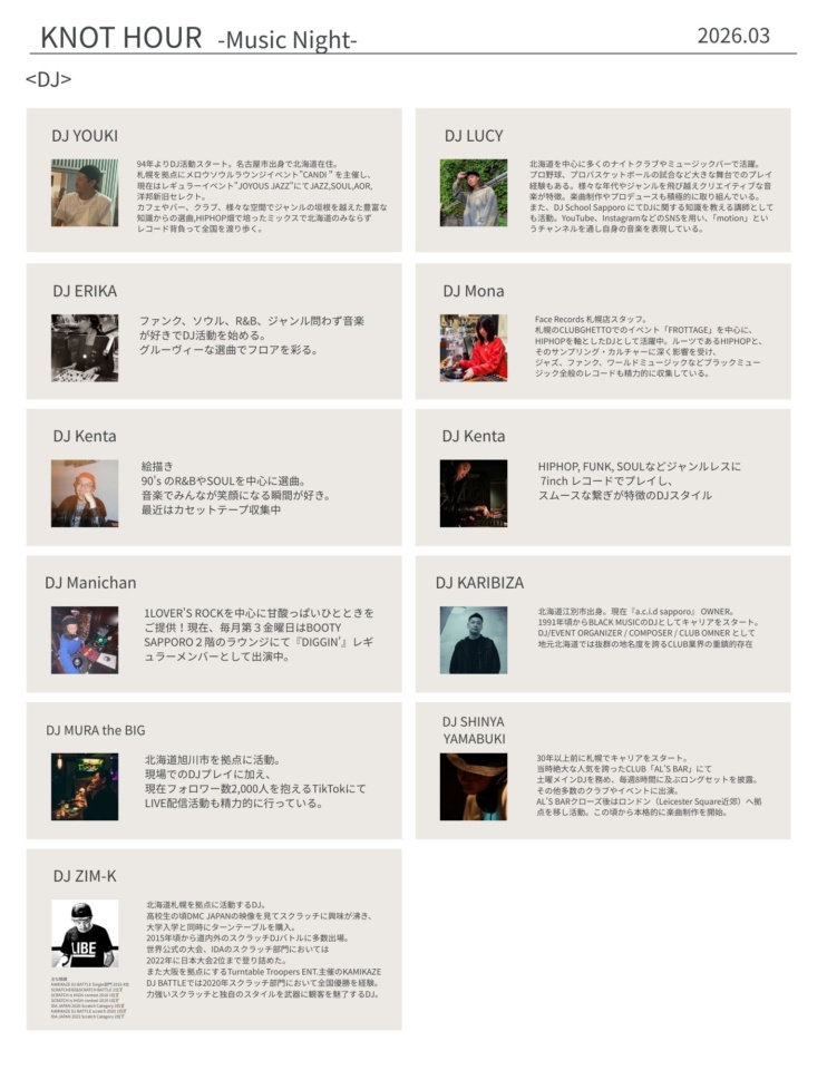 札幌を中心に活躍するDJたちが集結。ライブ感のあるサウンドを味わえます。