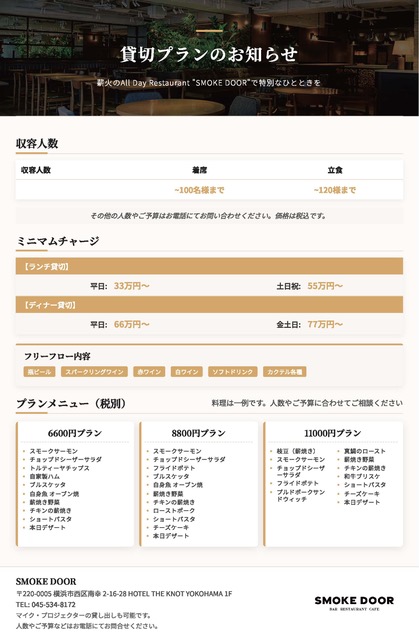 SMOKE DOORのクオリティはそのままに、気軽に貸切をお楽しみいただけるプランをご用意しました。期間限定の特別価格もご用意してあります。お気軽にお問い合わせください。